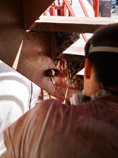 Les travaux commencent toujours par le retrait de la rouille et de la peinture qui écaille, le sablage des surfaces à peindre afin de les rendre lisses, et leur lavage, à l'acétone, afin de retirer les poussières qui pourraient contaminer le système de peinture.